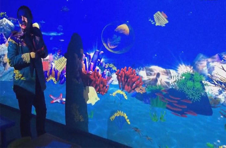 畫(huà)畫(huà)水族館通常投影在墻面上,有需要的時(shí)候可以通過(guò)曲面矯正系統(tǒng)改善投影畫(huà)面的清晰度等